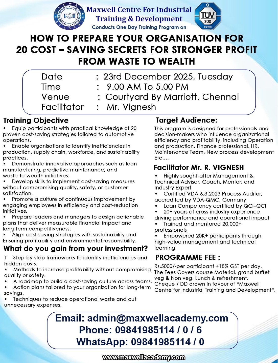 7 | 20 Cost – Saving Secrets for Stronger Profit from Waste to Wealth (Click here for Brochure) | Mr. Vignesh | 23rd Dec 2025 – Tuesday – 9am to 5pm | Rs. 5000 per participant / day + 18% GST | Courtyard by Marriott, Chennai |