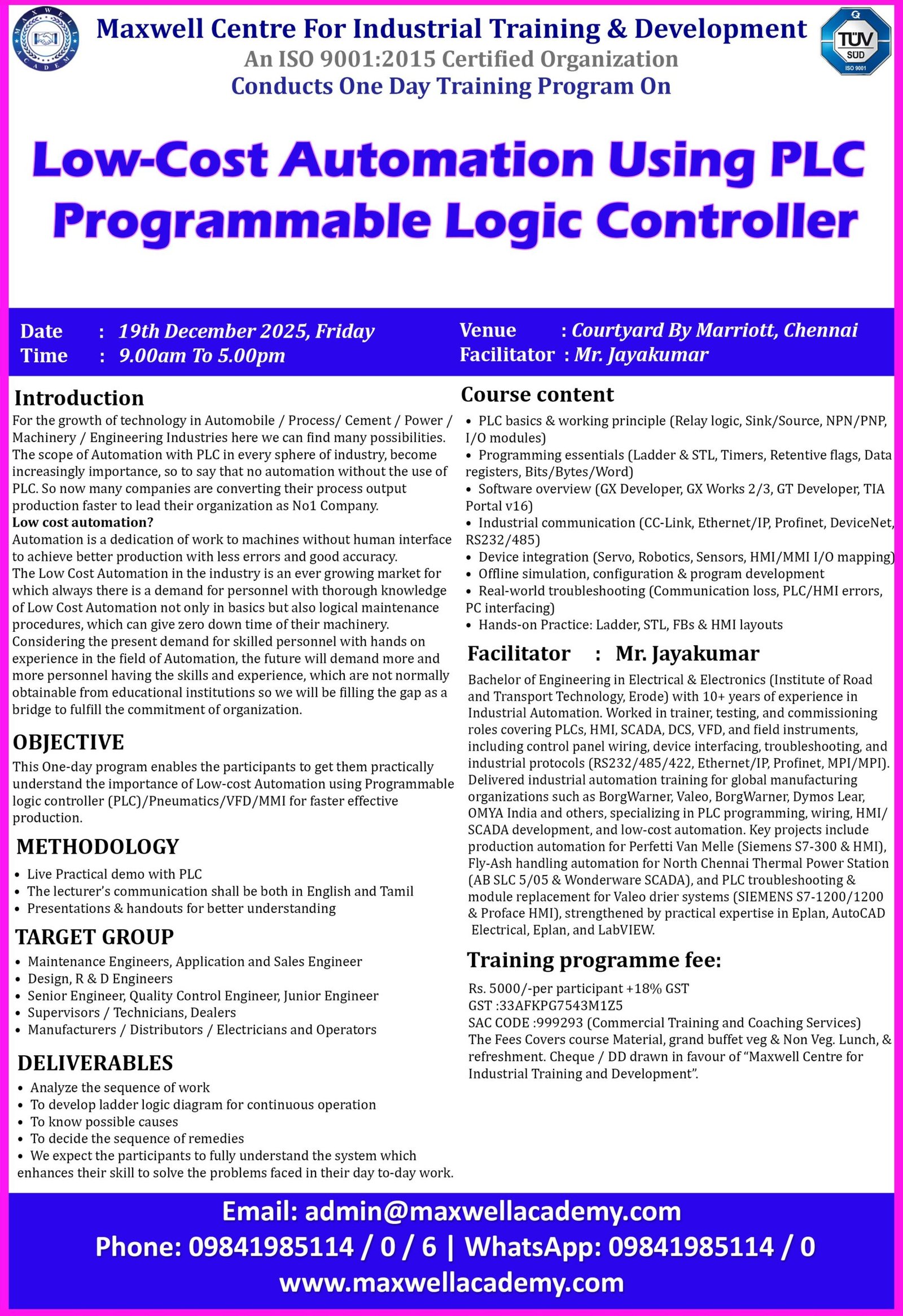 3 | Low-Cost Automation Using PLC – [Programmable Logic Controller] (Click here for Brochure) | Mr. Jayakumar | 19th Dec 2025 -Friday – 9am to 5pm | Rs. 5,000 per participant / day + 18% GST | Courtyard by Marriott, Chennai |