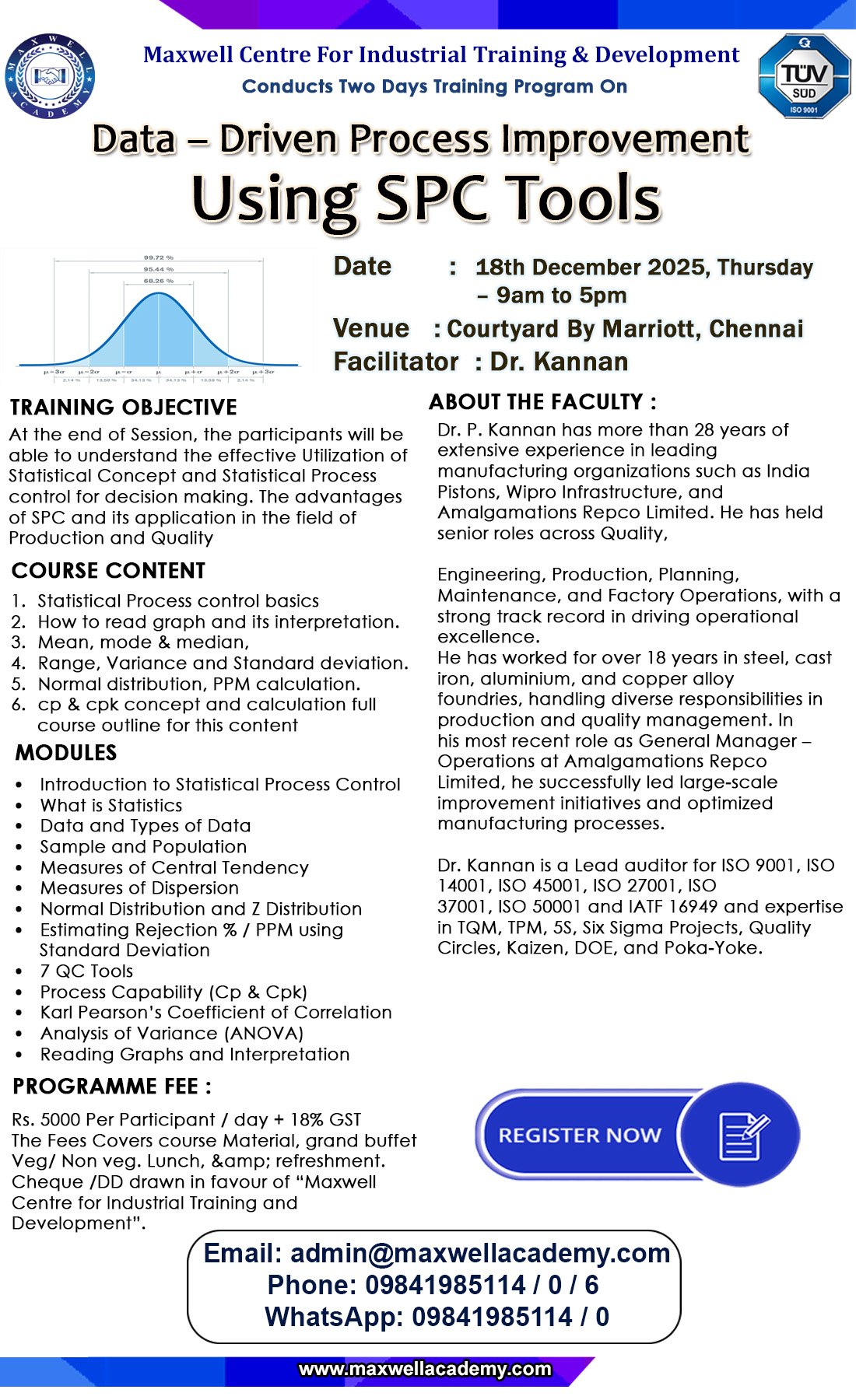 1 | Data – Driven Process Improvement Using SPC Tools (Click here for Brochure) | Dr. Kannan | 18th Dec 2025 – Thursday – 9am to 5pm | Rs. 5,000 per participant / day + 18% GST | Courtyard by Marriott, Chennai |