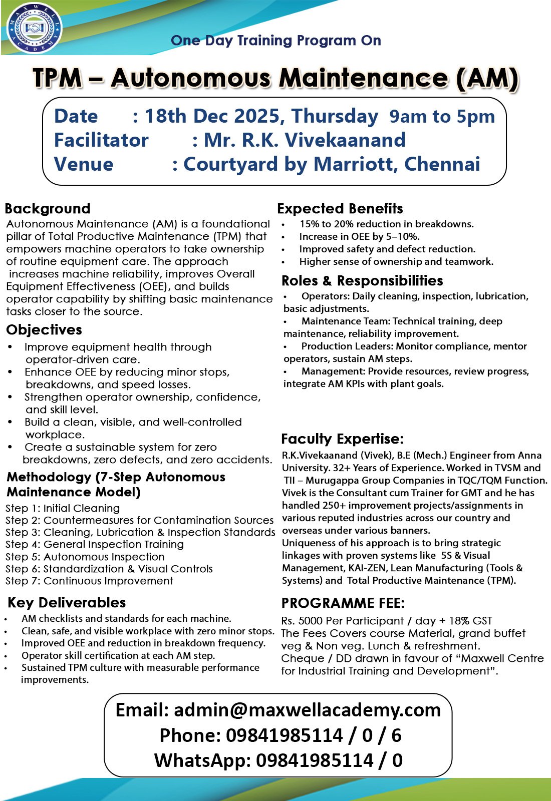 2 | TPM – Autonomous Maintenance (AM) (Click here for Brochure) | Mr. R.K. Vivekaanand | 18th Dec 2025 – Thursday – 9am to 5pm | Rs. 5,000 per participant / day + 18% GST | Courtyard by Marriott, Chennai |