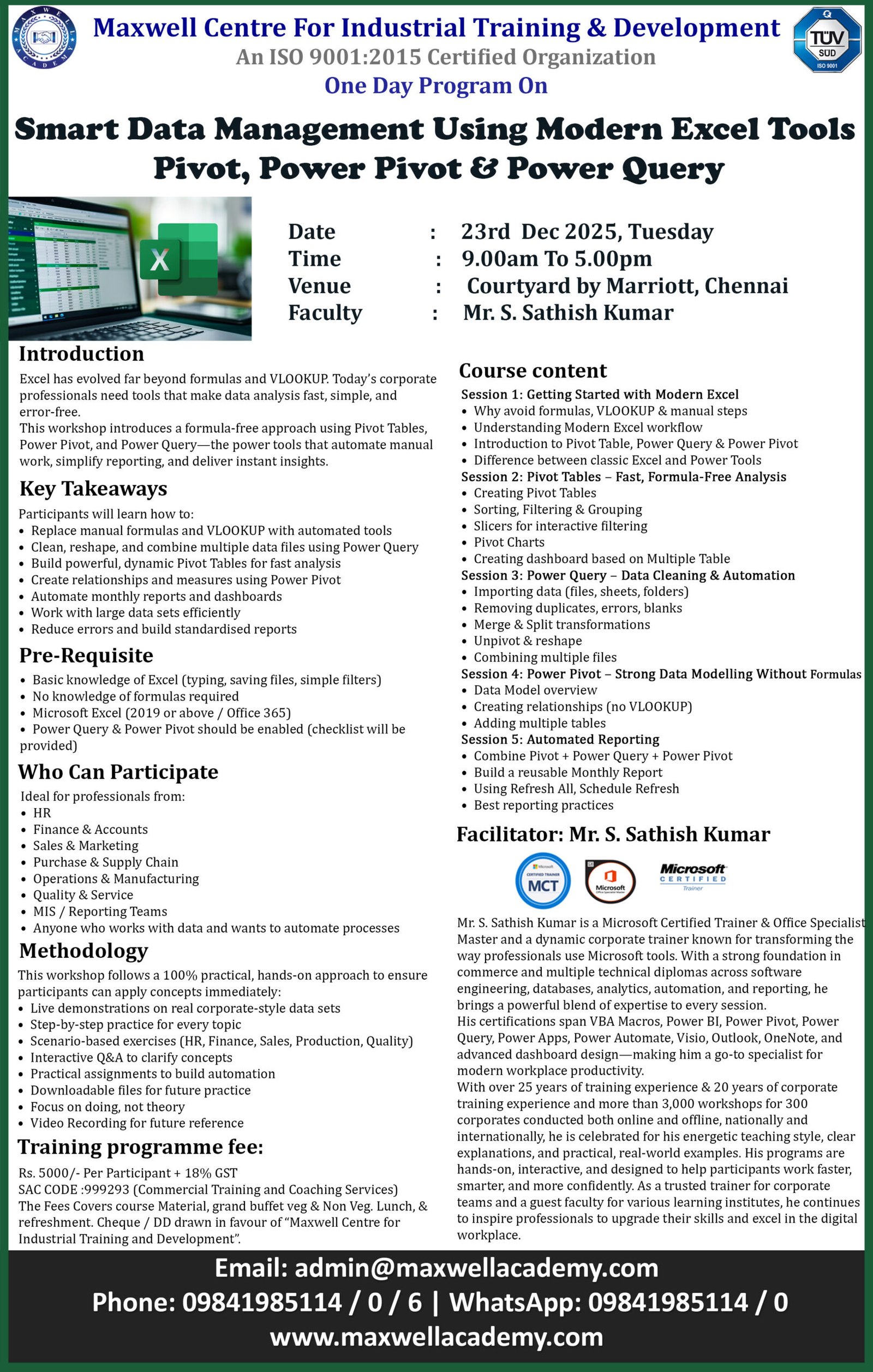6 | Smart Data Management Using Modern Excel Tools Pivot, Power Pivot & Power Query (Click here for Brochure) | Mr. Sathish Kumar | 23rd Dec 2025 – Tuesday – 9am to 5pm | Rs. 5000 per participant / day + 18% GST | Courtyard by Marriott, Chennai |