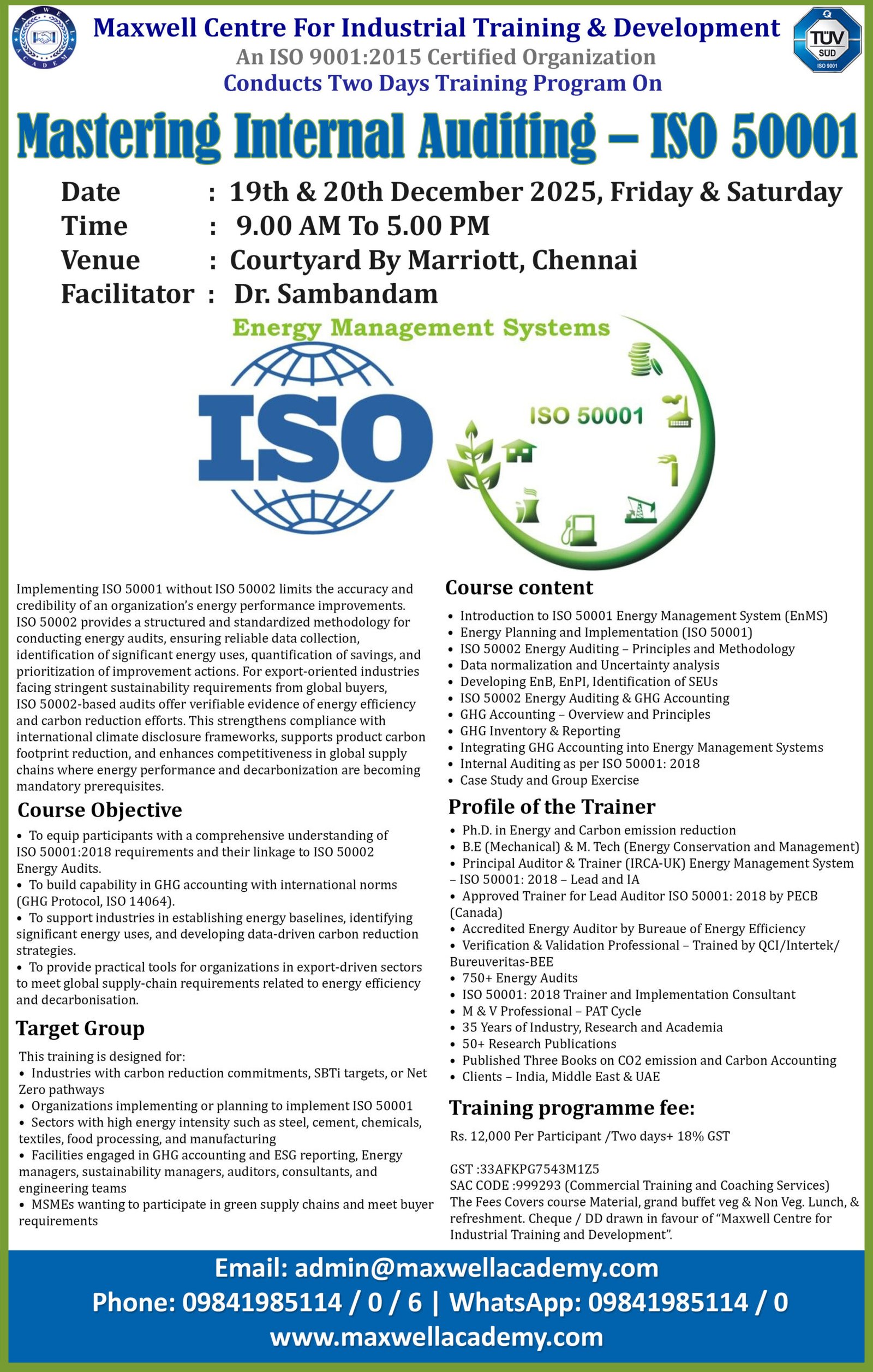 4 | Mastering Internal Auditing – ISO 50001 (Click here for Brochure) | Dr. Sambandam | 19th & 20th Dec 2025 – Friday & Saturday – 9am to 5pm | Rs.12,000 per participant / 2 days + 18% GST | Courtyard by Marriott, Chennai |
