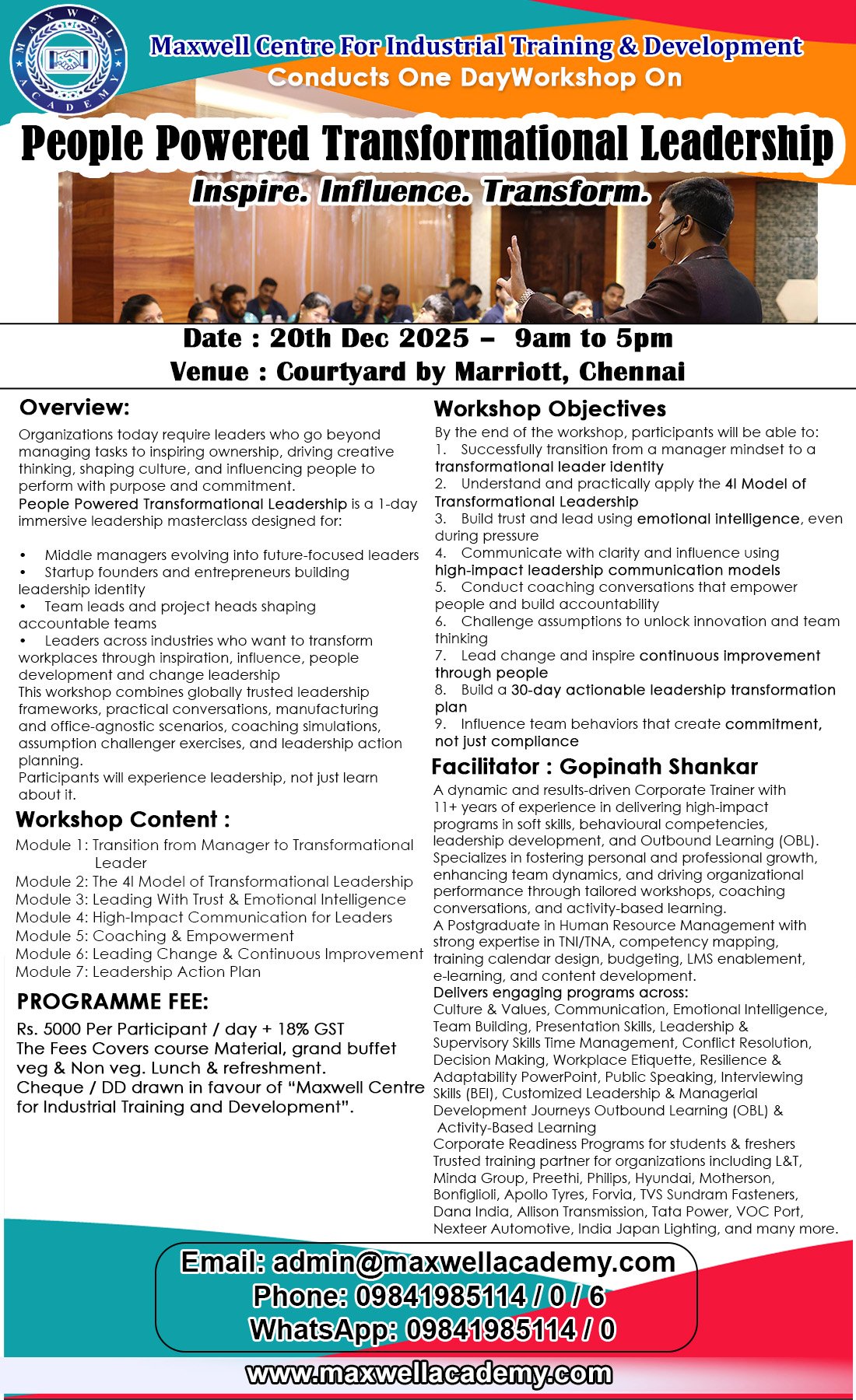 5 | People Powered Transformational Leadership (Click here for Brochure) | Mr. Gopinath Shankar | 20st Dec 2025 – Saturday – 9am to 5pm | Rs. 5000 per participant / day + 18% GST | Courtyard by Marriott, Chennai |
